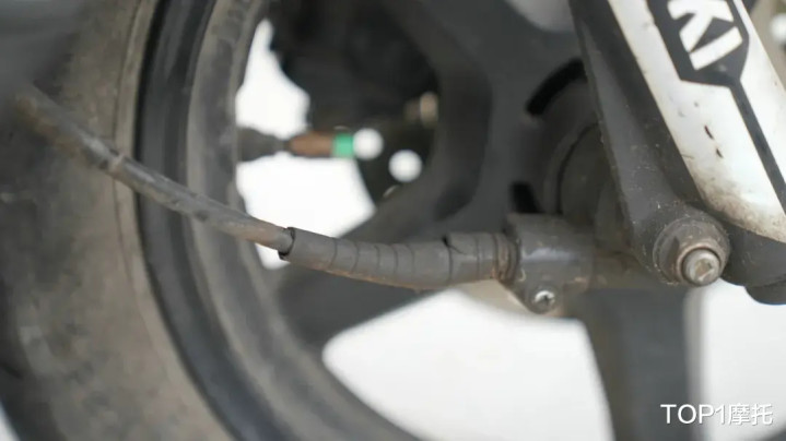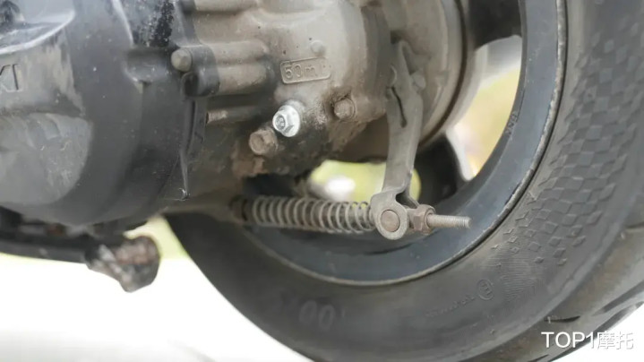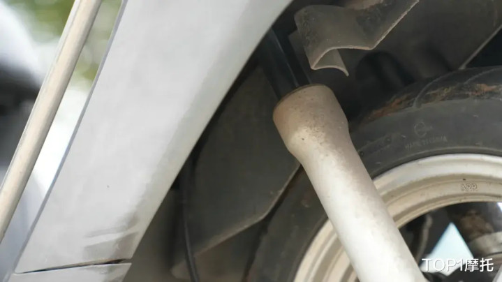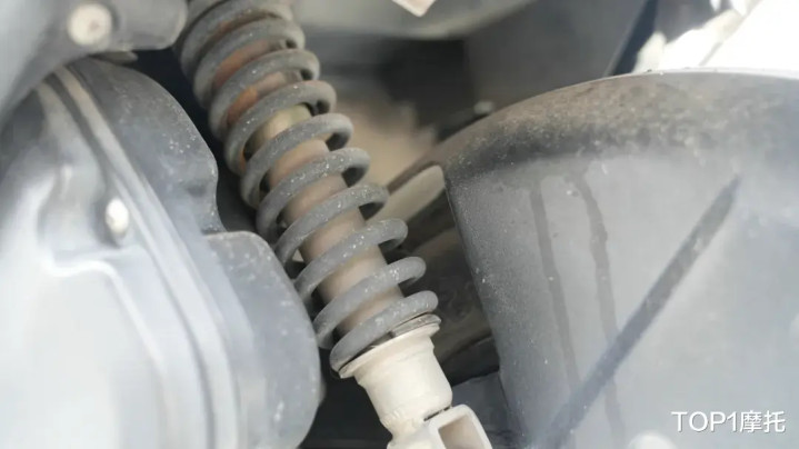 在底盘部分,这台行驶37万多公里的铃木UU125依然坚挺,前减震没有发现明显的渗油情况,不过减震的油封有所老化翘起,后减震同样没有任何油渍,只有些许的锈迹并不影响使用。