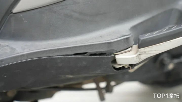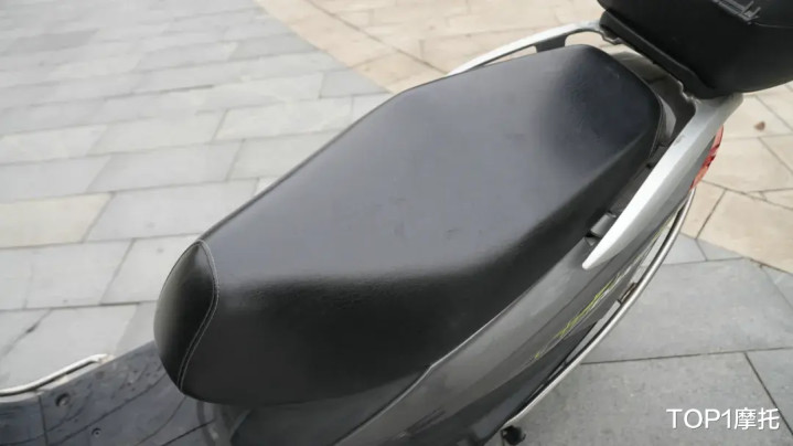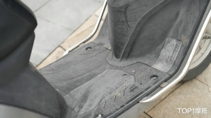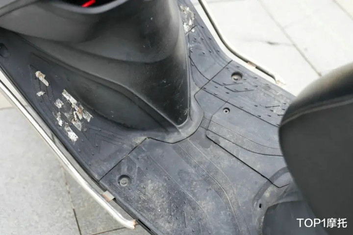 饱经风雨的坐垫成色如新,没有褶皱、没有褪色、更没有起皮,质量相当过硬;中间平踏板部分没有任何脚垫的痕迹,但肉眼可见的也没有任何老化开裂的迹象;不过坐垫底下常年累计的灰尘,以及车架铭牌上的时间蚀刻,都在宣告这台车对车主的长久陪伴。