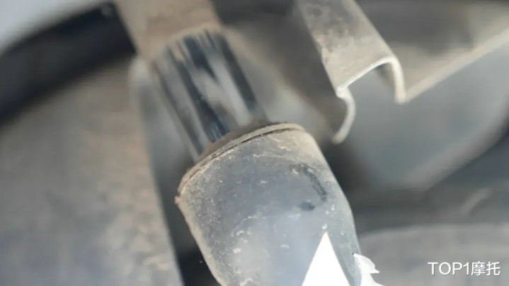 但是刹车的损耗比较明显,前刹车盘和刹车片都到了该更换的状态,里程传感器的线束胶套也有破损;轮胎肯定是换过的,所以前减震轴承有上过黄油留下的痕迹,沾染的油渍和灰尘产生的混合物,也被遗留在减震底端,后刹车的刹车鼓也有明显磨损,弹簧剩余的行程已经不多了。